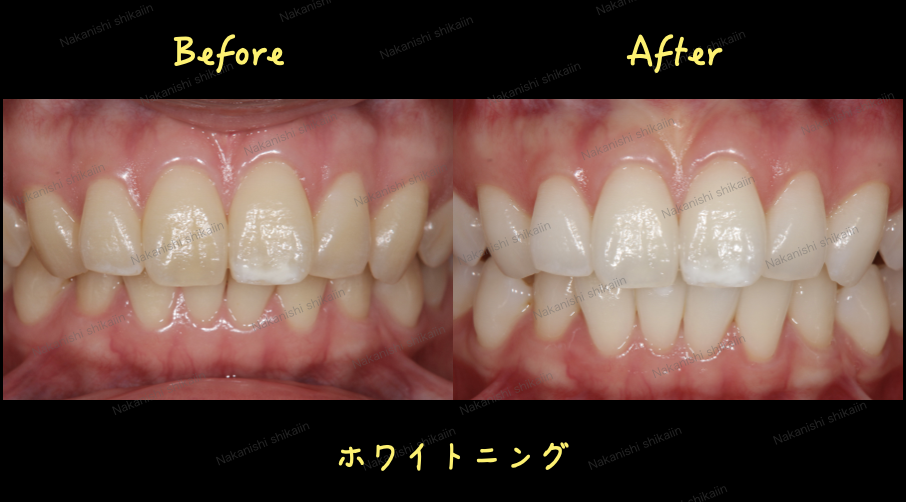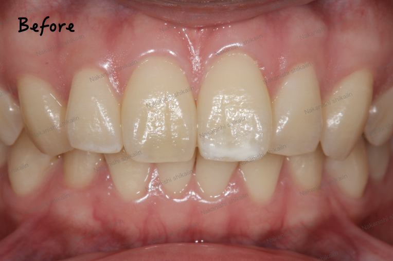 ホワイトニングは歯が白くなりますが、もともと歯の模様は無くなりません。写真では、ホワイトスポットと呼ばれる、歯の表面に白濁した状態があります。これは生まれつき、あるいは幼少期の虫歯になりかけたことなどから生じる模様です。