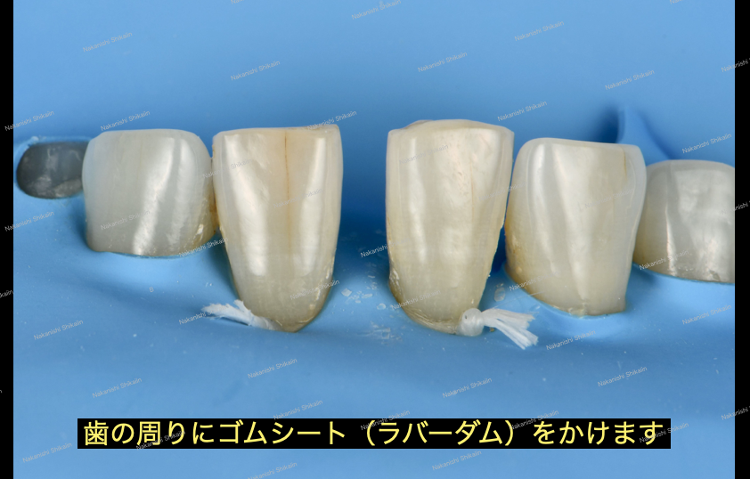 実際の治療の雰囲気です。歯の周りにゴムシート(ラバーダム)をかけます。理由はいくつかあるのですが、簡単にいうと【①薬液が粘膜にかからないようにする ②詰め物の物持ちの向上】が上がります。