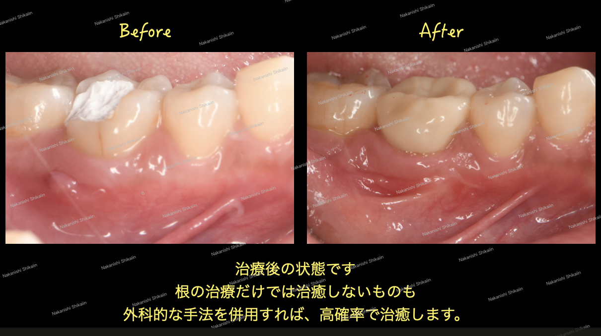 もちろん、すべてのケースで歯根端切除術で治る訳ではありません。歯が割れていた場合はそもそも抜歯となりますし、範囲が大きすぎると不適応となります。