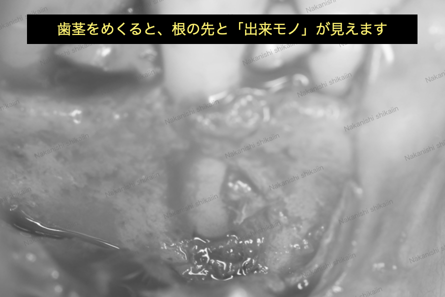 麻酔をした上で、歯茎を切開し、内側を目視します。根の先に出来モノを確認しました。あとはこれを綺麗に取り除くだけです。