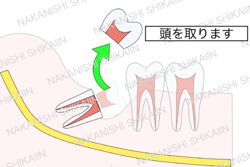 神経と歯の根が接触、密接している場合は2回法という術式を取ることもあります。これは、歯の頭を抜き、歯の根はそのまま放置します。3ヶ月〜半年、1年など、時間を置くと、残された歯の根が伸びてきます。そうすることで神経から伸びた分だけ離れるため、神経麻痺のリスクを回避することができます。放置する期間は決まってません。要は神経から離れてくるまで期間を置きます。