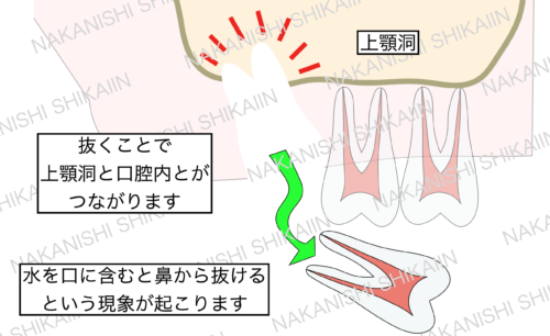 上の歯は「上顎洞」という鼻の穴があります。親知らずの根っこがこの上顎洞に入り込んでいる場合、歯を抜くと上顎洞に穴があくことがあります。穴があくと、例えば水を口に含むと鼻から水が漏れ出るという現象が起こります。