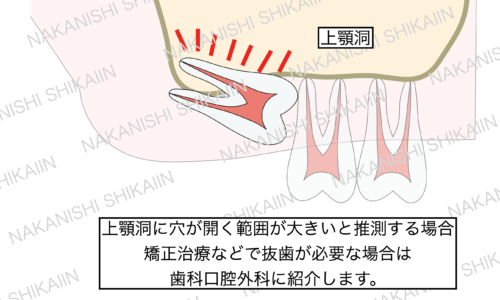 親知らずの抜歯について。親知らずが上顎洞という穴に食い込んでいる時があります     親知らずの抜歯について。親知らずを抜くことで上顎洞と口腔内が繋がり、水を口に含むと鼻から抜ける現象が起きます
