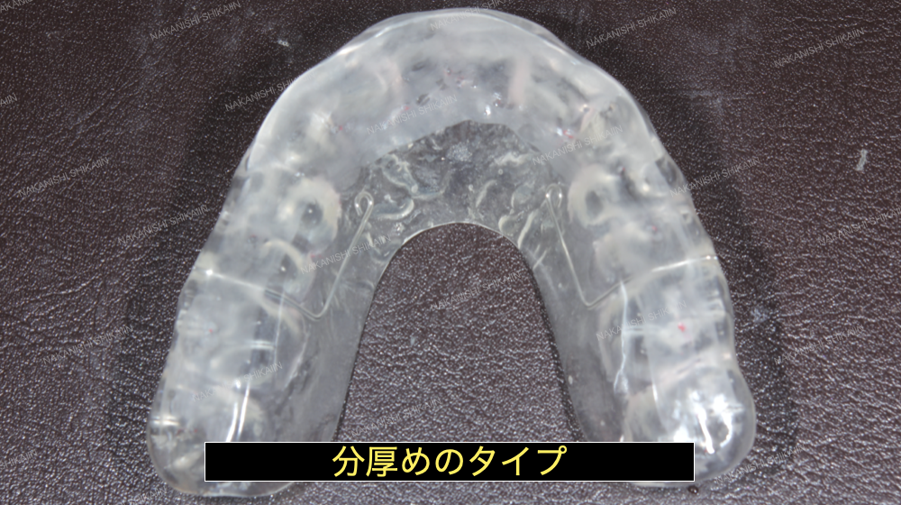 このタイプの欠点は、分厚さがある違和感や装着感が強いことです。また、分厚いマウスピースによって唇が押し出され、口が閉じにくいことです。夜間これをつけて寝ると、歯ぎしりにとっては良いですが、口がぽかんと開いた状態で寝ることになるので喉が乾燥し、体調を崩しやすくなります。口止めテープなどで対策はできますが、そこまでしないといけないのかという煩わしさがあります。年齢が上がると喉の乾燥による免疫力低下は、1日だけならまだしも、期間が長くなるとボディーブローのように気付ければ風邪を引き長期化してしまうため避けたいところです。ですが、今回のように「歯ぎしりにより生じる影響、症状を防ぐ」という点においてはこのタイプが一番効果的です。