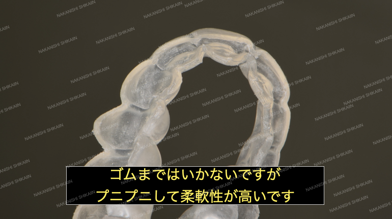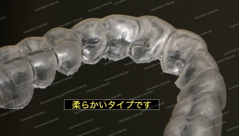 装着した時の歯への絞めつけ感覚が一番弱いため、違和感が比較的に少ないです。その代わりに、材質がやらかいため、歯ぎしりが激しい場合はすぐ穴が空いてしまします。補修ができないので、穴が空いたら作り替えとなります。