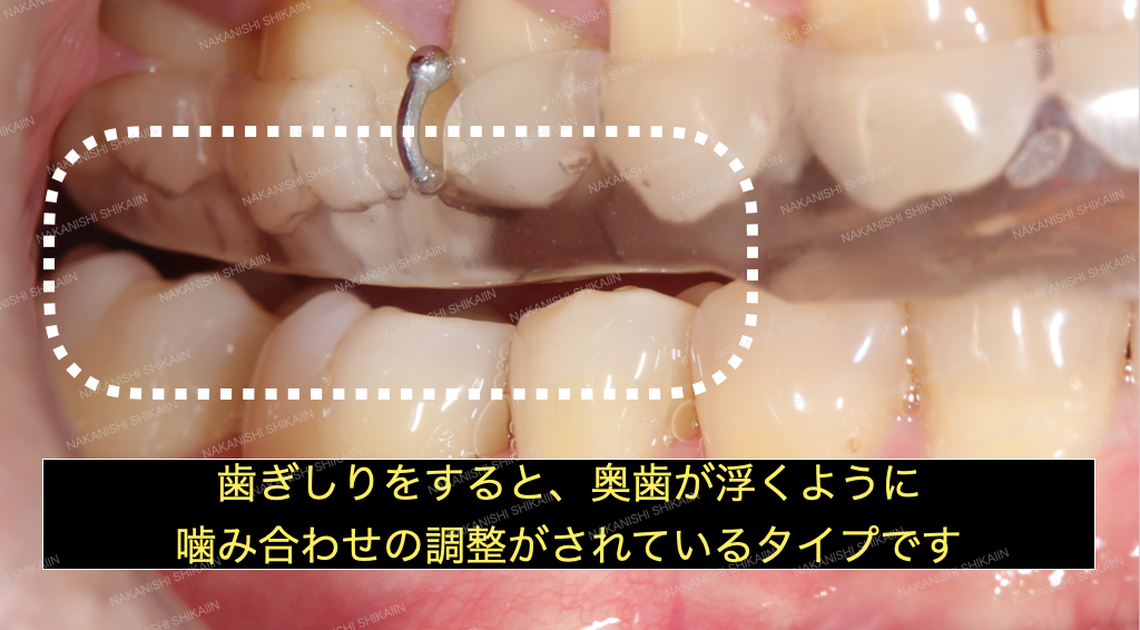 これは装着した時の違和感が一番強いものになります。専門用語では「スタビライゼーションタイプ」とも言います。これはカチカチ噛むと全体が当たりますが、歯ぎしりで歯をギリギリさせると奥歯が浮くように噛み合わせを調整されています。一般的に歯ぎしりでの横揺れは糸切り歯は強いので受け止められますが、それ以外の歯は歯ぎしりの横揺れに非常に弱いです。そのため、このタイプが一番歯を守るためには一番良いものとなります。もちろん歯ぎしりの状態や元々の噛み合わせによっては不向きなこともありますので歯医者さんでの判断になります。
