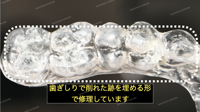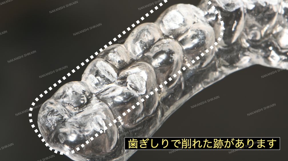 あまりに激しいと、経年的に削れていき、奥歯も干渉しはじめ、マウスピースが全体的に削れていきます。その時は作り替えか修理となります。