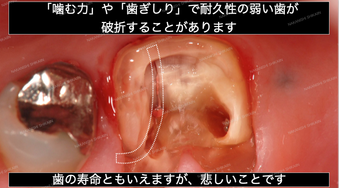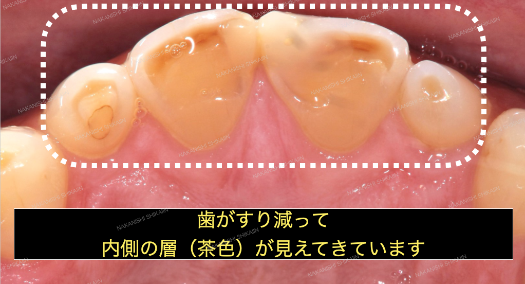歯が少しずつ擦り減ってきます。そうすると歯が短くなってくるため、見た目の問題がでてくることがあります。また歯が擦り減らずに歯と歯茎の境目付近が削れる、凹んでくることがあり、そこが「冷たい水がしみる」ということもあります。