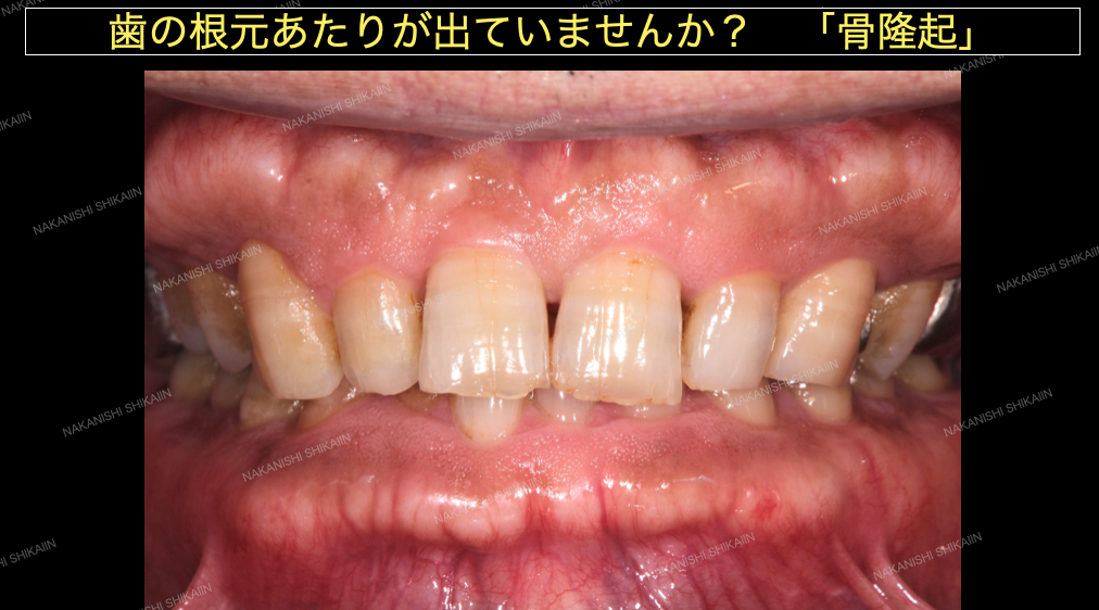 症状というより「変化」です。上顎や下顎の骨がボコっと膨らんできます。具体的な場所として歯の根元あたりと、下顎では内側の舌で触れる範囲、上顎では鼻の下に当たるところです。これは痛みなどはないですが、骨がボコっと出るので、場所によっては鬱陶しさや発音のしにくさ、歯ブラシのしにくさが出てきます。ですが少しずつ骨が出てくるので、自然と舌なども慣れていくことから、そこまで困る人はさほどいないというのも実情です。入れ歯を使っている人にとっては弁慶のスネどころのように当たると痛いので困ることがあります。また、上顎がボコっと出ると、発音のしにくさのほか、食事で当たって痛いなどもあります。