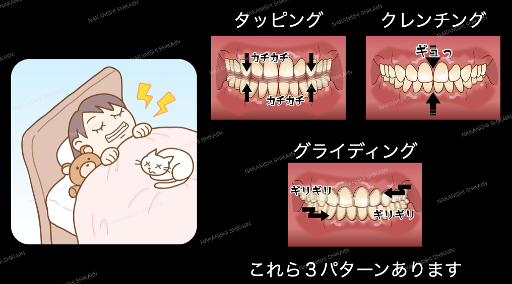 「歯ぎしり」一度は聞いたことがあると思います。寝ている時や無意識の時に、強い力で上下の歯が擦り合わさり「ギリギリ」と音がなることです。専門用語では「ブラキシズム」とも言われます。厳密には3つのパターンがあります。上下の歯を強い力で食いしばるだけの「クレンチング」、上下の歯をすり合わせて音が鳴る「グラインディング」、上下の歯をカチカチさせる「タッピング」というものです。