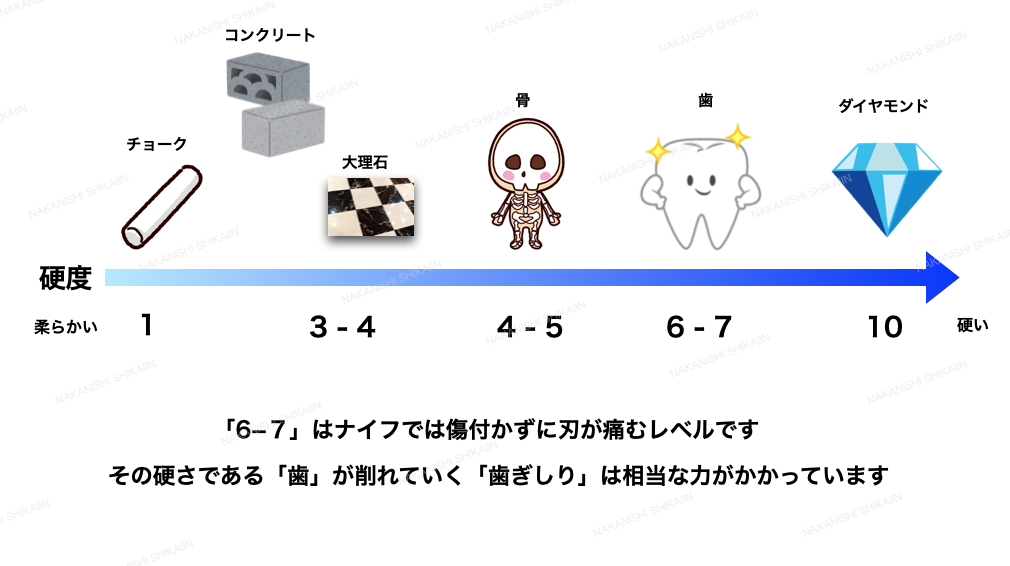 歯ぎしりで歯が削れることがあります。歯の硬さはモース硬度という指標では「7」です。具体的なものとして、ダイヤモンドが「10」、骨が「4−5」です。コンクリートや大理石が「3−4」です。日常的にわかりやすいコンクリートや大理石を超えて、骨より硬いものが歯になります。これが簡単に削れるわけなので、音が鳴るくらい歯ぎしりをしている方は相当な力がかかっています。