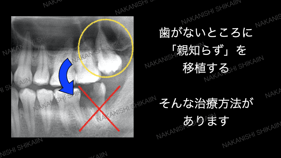 歯が無くなった場合は、通常「ブリッジ」「入れ歯」「インプラント」という治療選択肢があります。ですが、健全な親知らずがある場合は「移植」という手法があります。親知らずを抜き、その親知らずを歯が無くなったところに移すという治療です。