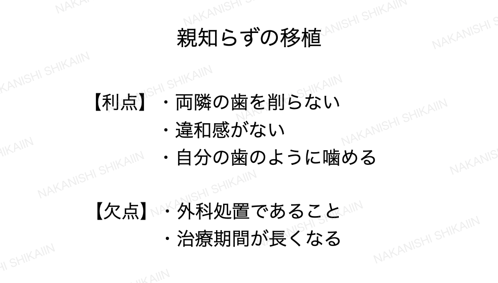 一方で移植の場合は両隣の歯を傷つけることなく治療が完了し、かつ噛む力も本来の自分の歯のように使えるため最適です。欠点としては親知らずのサイズや移植する側の状態次第では不適応になることや、外科処置であること、治療期間が長くなることが挙げられます。移植したくても全身疾患などで制約があると不適応になるため、全ての人に適応するとは限りません。