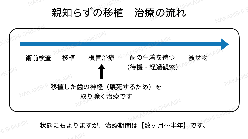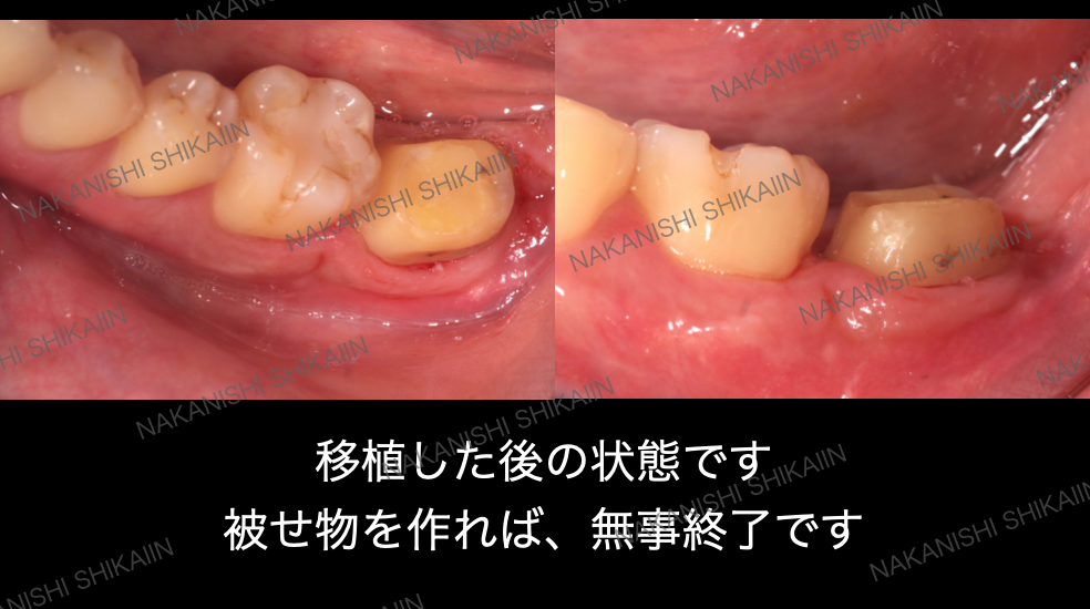 移植自体はその日に終わりますが、その後は経過観察と移植した歯の治療をしていく必要があります。移植した歯は、神経が死んでしまいます。そのため、移植後、数週間したら根の治療(根管治療)が必要です。その後、移植した歯が歯茎にしっかりと成熟、付着するまで2ヶ月〜半年ほど起きます。この経過観察する期間は移植した場所の状態によります。最終的に大丈夫なことを確認すれば被せ物の治療を行います。