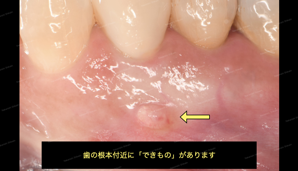 歯茎の白いできものや腫れは、歯の神経の管にバイ菌が入り込み、根の先から歯茎へと飛び出て、そこで炎症を起こしている状態です。神経が死んでしまった歯や、神経の無い歯に生じます。というのは、神経が生きていると神経が反応して痛い、沁みるなど症状が出ます。これは、無症状で進行することが多く、仮に症状があるとすると、違和感、歯が浮いたような感覚、噛むと痛いなどが多いです。時にズキズキすることもあります。