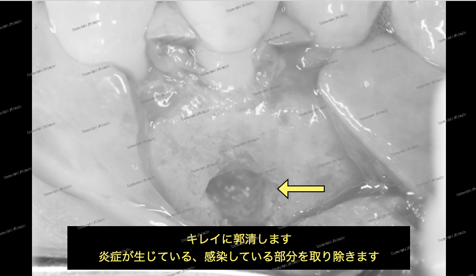 プクッとしている部分を綺麗に掻爬します。このプクッとしている部分が細菌感染している部分です。しっかり掻き出すことで、その部分が空洞となり、一方で白い骨の部分のみが確認できます。
