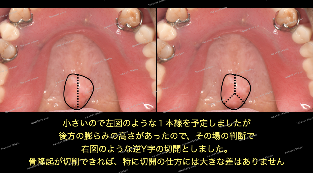口蓋隆起に対して1本の切開線を予定していましたが、後方の膨らみに大きさがあったので、その場で逆Y字の切開としました。