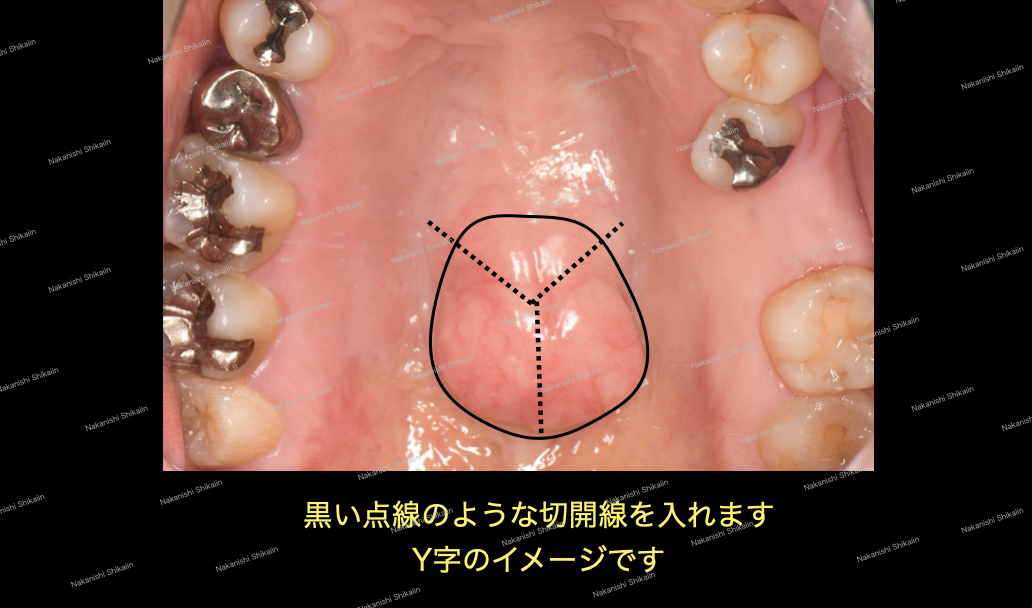 上顎の口蓋隆起に対して、Y字の切開線を入れます。