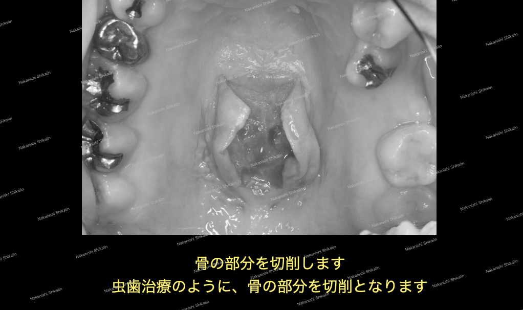 切開し、口蓋隆起つまり骨が出ているところを剥き出しにします。その後、切除して行きます。