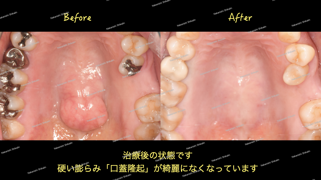 上顎のかたいできもの口蓋隆起がなくなりました。比較すればはっきりと違いがわかります。