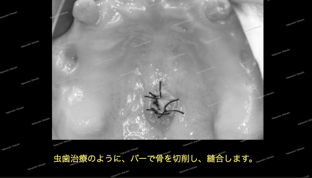 上顎の口蓋隆起を切削し、縫合しました。