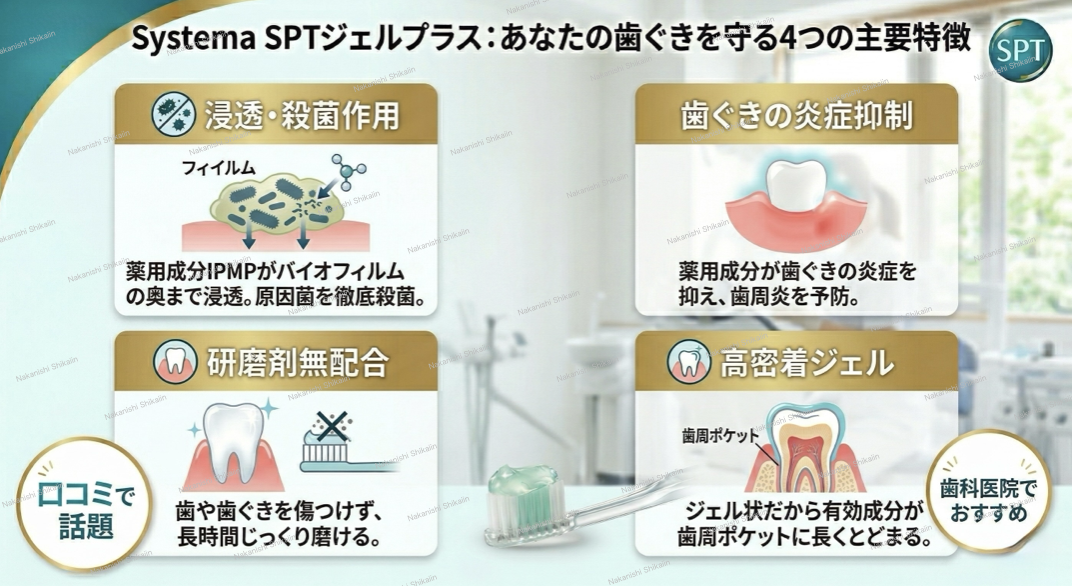 歯周病対策としてSPTジェルが良い理由としての特徴をご紹介します。