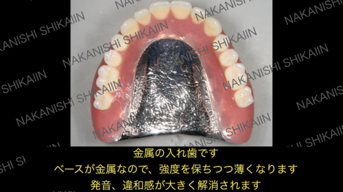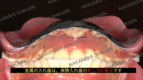 総入れ歯であればさらにこの厚さの違いがはっきりと現れます。小さい部分的な入れ歯では薄さの改善については実感が難しいですが、大きい入れ歯であればあるほど、保険プラスチックと金属の分厚さの違いを大きく実感できます。