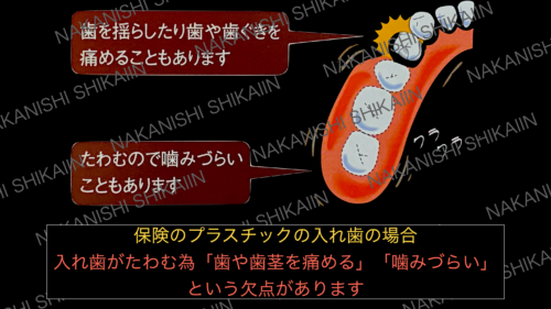 これも入れ歯の面積、入れ歯の歯の数が多ければ多いほど実感できます。保険プラスチックであれば大きければ大きいほど、たわみが大きくなるので歯肉への負担が大きくなります。
