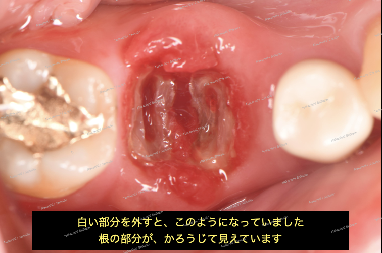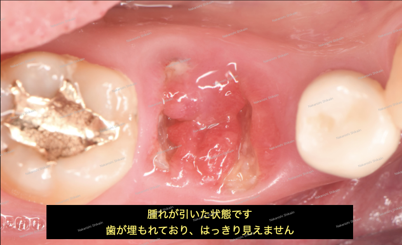 詰まっている土台を外すことで、内側のものが解放され、炎症としての腫れがひきました。歯の輪郭が見えていない状態です。この状態では、通常、抜歯が選択肢に入ります。ですが、抜歯の1択ではなく、一生持つかどうかは別ですが、歯を残す、歯を抜かない治療選択肢もあります。