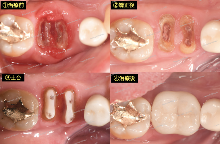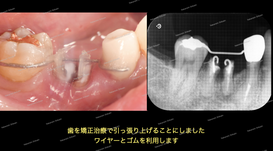 上記のような理由で抜歯となるわけですが、言い換えると歯の輪郭され確認できれば被せ物などをつけることが可能となります。様々な治療方法がありますが、その中の1つに歯を引っ張り上げる治療方法、矯正的挺出と呼ばれるものがあります。埋もれている歯を引っ張り上げることで、歯の輪郭をあらわし、被せ物をしても歯茎を挟むことなく治療していけます。