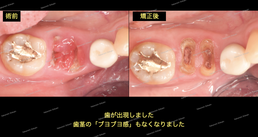 一方で、移植した側の状態です。どうしても見た目は異物感がありますが、体感としては一体化しているので問題ありません。時間とともに周囲の歯肉と馴染んできます。術前・術後を見ても、移植した歯肉と周囲の歯肉が馴染んできているのがわかると思います。