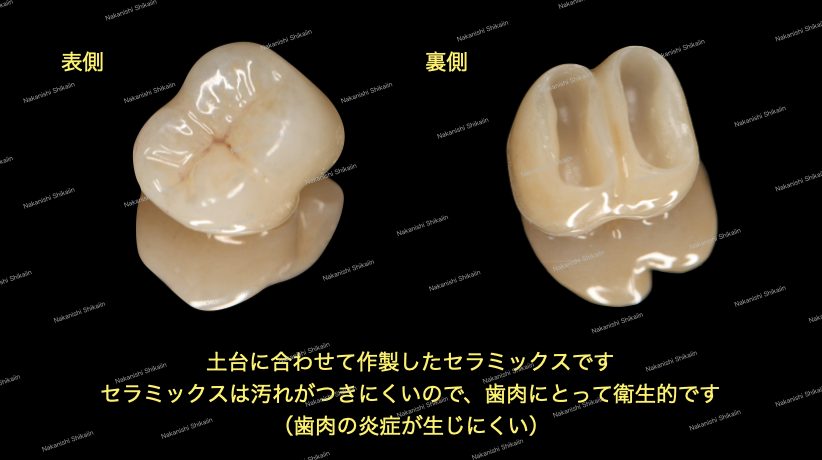 出てきた歯に対して土台をたてます。その後、被せ物を作っていきます。被せ物には種類がありますが、今回はセラミックスで作成することになりました。セラミックスはプラークと言われる歯の汚れがこびりつきにくいため、セラミックスに付着した汚れは簡単に洗い落とせます。そのため、虫歯になりにくい、あるいは歯肉の炎症が生じにくいです。