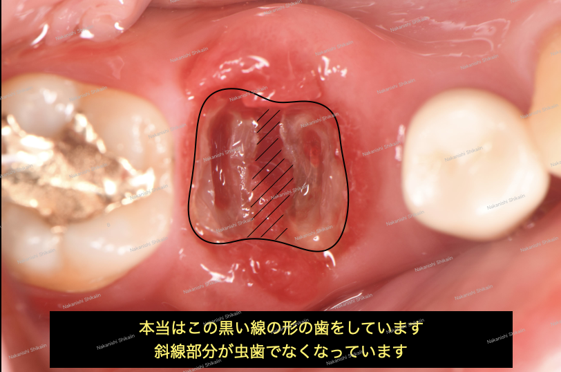 白いものを外し、残っている歯がどのような状態かを確認したところ、下記の写真のような歯になっていました。本来は、奥歯は大臼歯と言われ、この見えている2本の根っこがつながっているのですが、これは完全に分かれています。図のように、黒い線で囲まれているのが本来の歯の形です。斜線部分も本来は歯がある部位ですが、虫歯によって断裂、歯のつなぎ目が失われています。