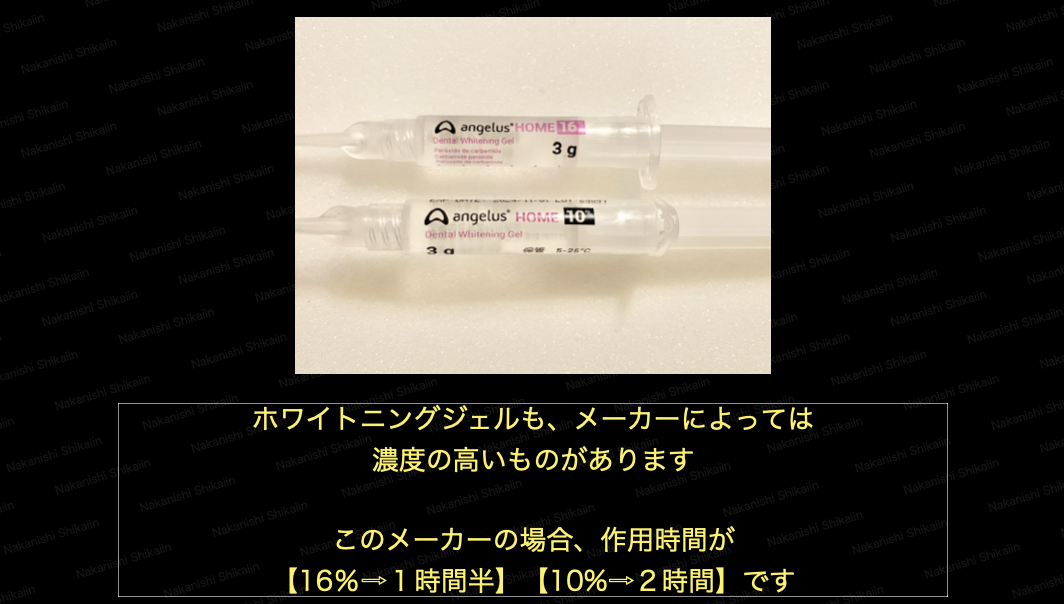 濃度が10%のものは、作用時間が約2時間とされていますが、濃度が高いものは、作用させる時間が1時間半など、その分、短く設定されています。使い分けについては、主に知覚過敏の強弱となります。濃度が高いものはそれだけ刺激が強いので、知覚過敏が生じやすくなります。一般的には10%のホワイトニングジェルを使用することが多いのですが、歯科医院によっては16-20%と濃度の高いホワイトニングジェルがあるところもあります。