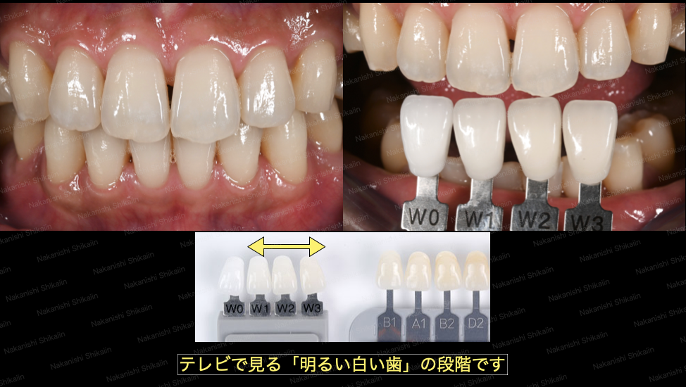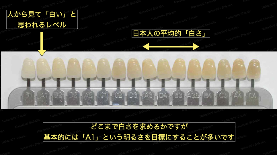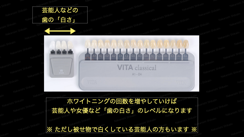 目標の白さが芸能人や女優の歯の白さであれば、ホワイトニングシェードという、ホワイトニングならではの白さのスケールがあります。基本的に、このホワイトニング専用のスケールまで白くなると、テレビの世界の歯の白さです。ただし、テレビの世界の方は、被せ物で人工的な白さにしている方もいらっしゃいますので、その白さにはなりません。