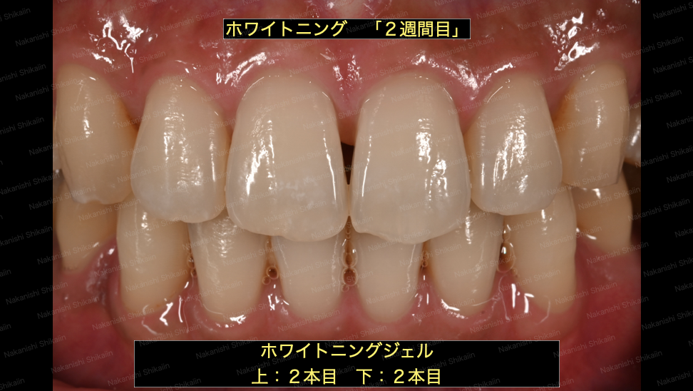ホームホワイトニングの2週間後です。以前に比べて白くなってきています。2週間ということで、この段階で上顎でジェル2本、下顎でジェル2本、合計4本を使用している段階です。2週間使用したら、この後は1週間休憩を入れます。