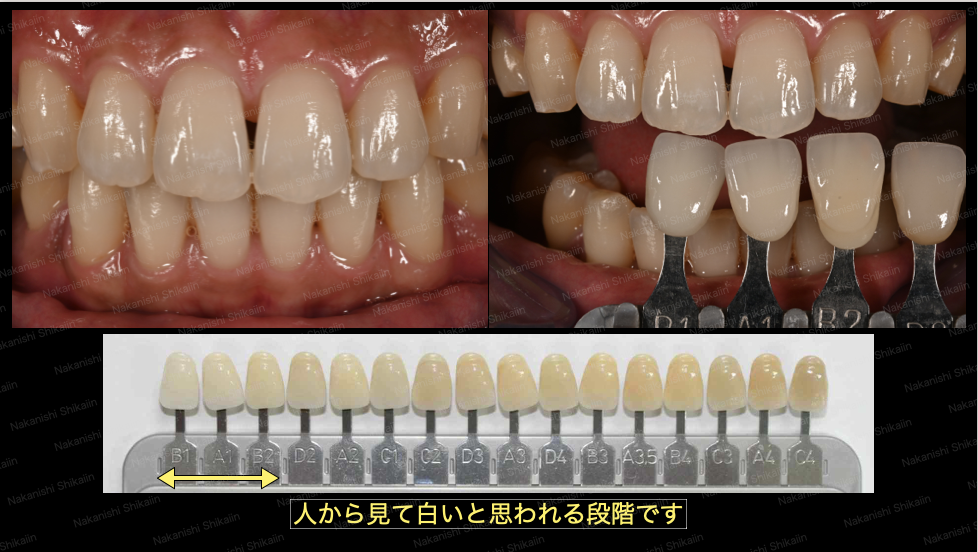 この段階でホワイトニングにおける歯の白さのガイドシェードを用いて、どれくらいの白さか確認したところ、前歯は平均的な白さと判断しました。1週間でも効果が出ていることがわかります。