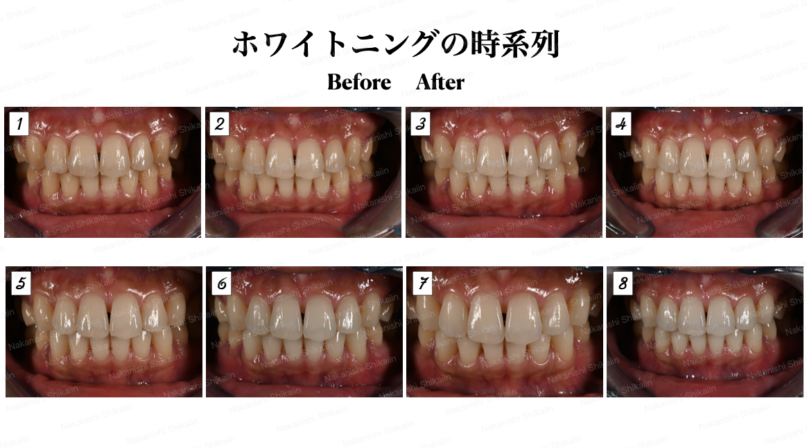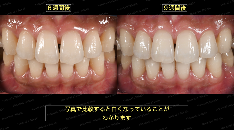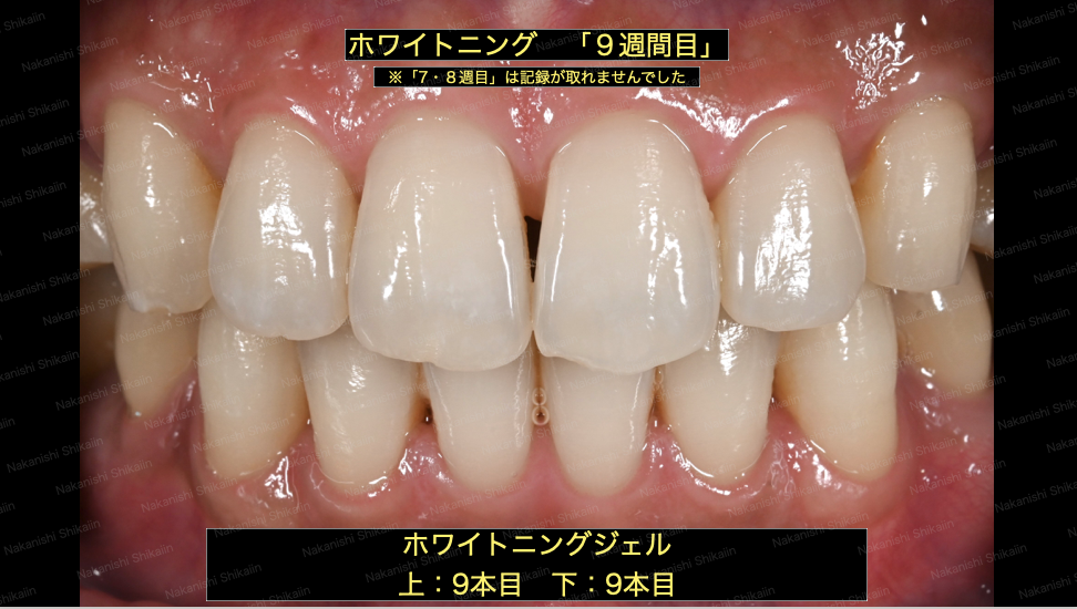 ホワイトニングですが、ここにきて9週間後(ホワイトニング2週間+休憩1週間+ホワイトニング2週間+休憩1週間+ホワイトニング2週間休憩1週間+ホワイトニング2週間+休憩1週間+ホワイトニング1週間)に飛びます。7−8週間後の経過は患者都合もあり記録を取ることができませんでした。