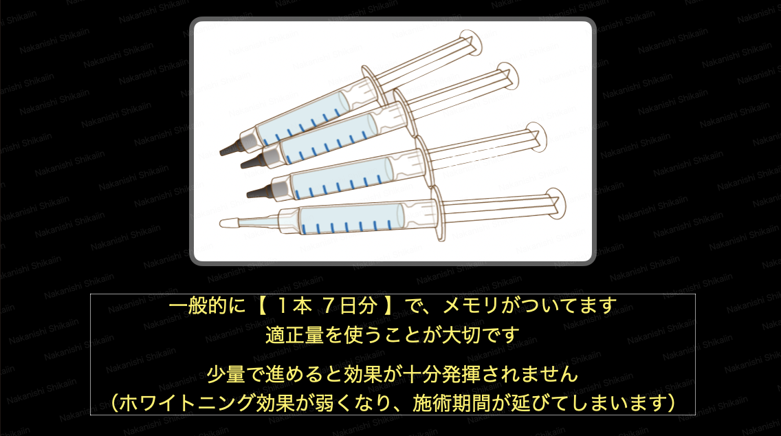 先述しましたが、基本的には濃度10%のホワイトニングジェルの場合、1日2時間、これを2週間続けます。1本のホワイトニングジェルで7日間分ありますので、2週間続けるためには2本のホワイトニングジェルが必要になります。ただし、1本で上顎か下顎の前歯6本分なので、上下の前歯をホワイトニングしていくには、その2倍の4本必要です。つまり、上下の前歯のホワイトニングは、1日2時間を2週間行う場合、合計4本必要となります。
