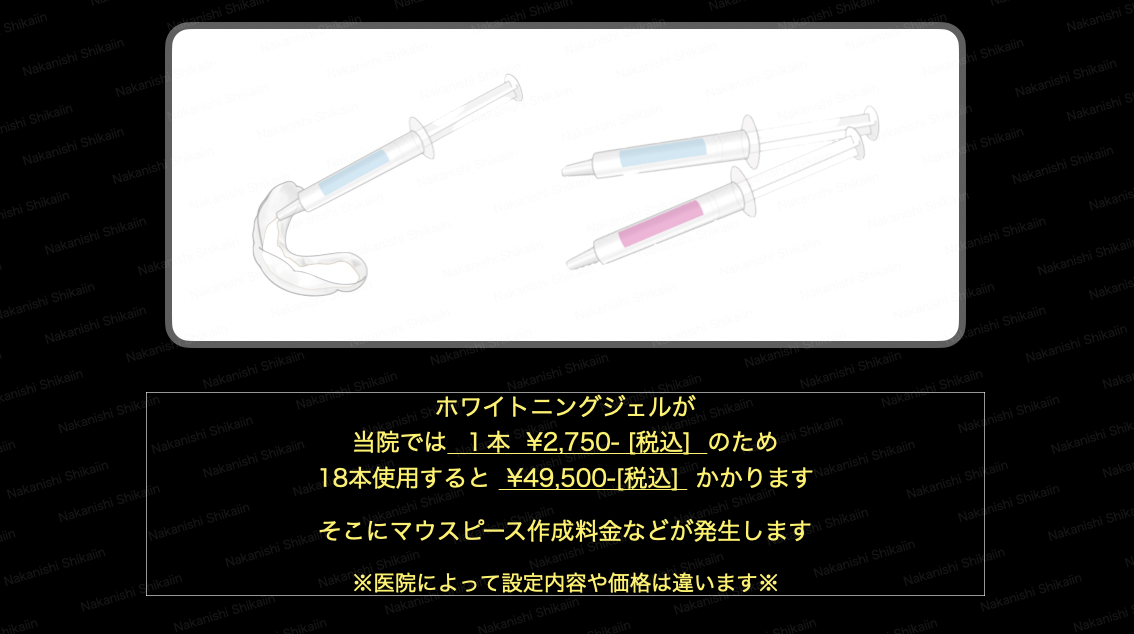 ホワイトニングのジェルは、合計で18本となりました。ホワイトニングジェルは歯科医院によって費用は違いますが、当院の場合では、ホワイトニングジェルは1本¥2,750-税込なので、18本では¥49,500-税込となります。