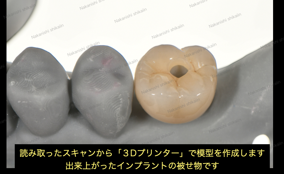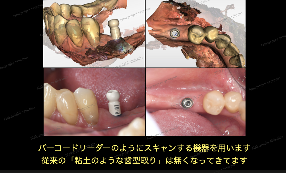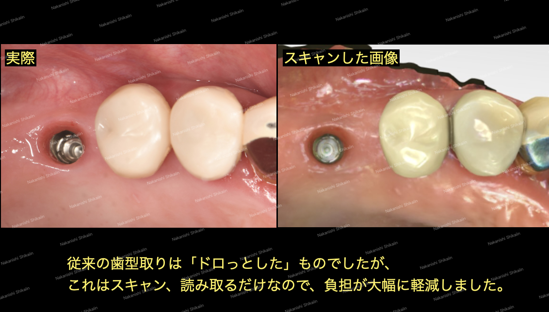 処置後は骨の状態によりますが、数ヶ月〜半年の経過を待ち、歯型をとり、被せ物を作ります。昔はどろっとしたものを入れて歯型をとってきましたが、近年はスキャナーと呼ばれるものがあり、バーコードを読み取るようなイメージで歯の形を機械で読み取ることで歯型をとることができます。歯型とりが苦手という方もいらっしゃると思いますが、この点においては大きく進歩したと言えます。実際の状態と、スキャンした画像を並べています。より近代化していることが歯科業界の人間も実感できます。