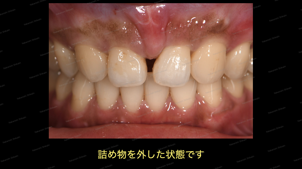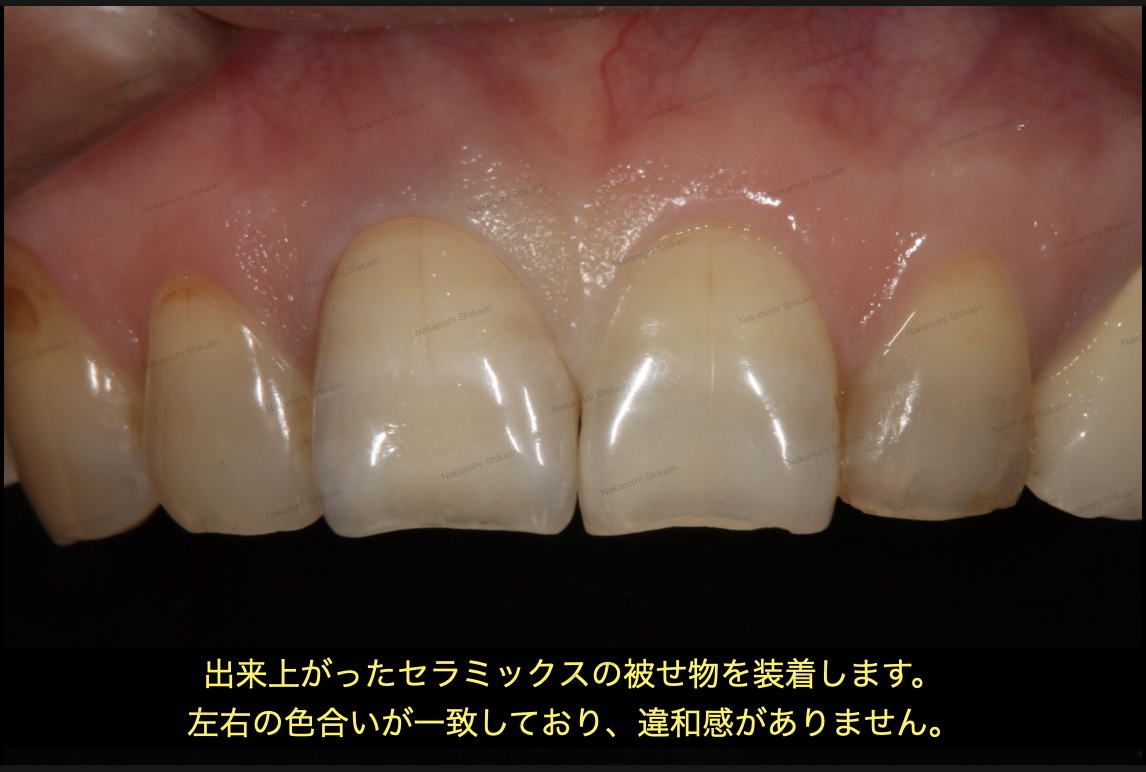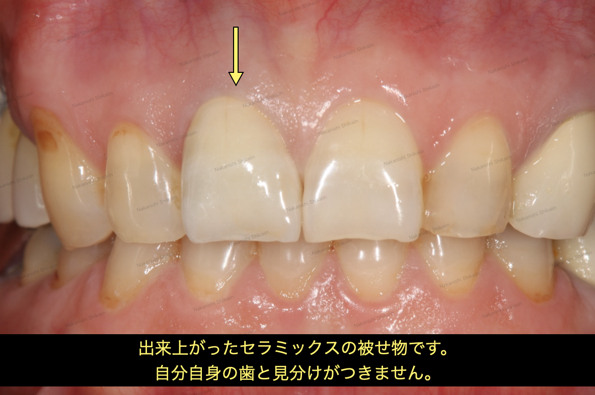 前回の状態を受け、セラミックスの被せ物の色合いを変更したものです。写真のように、セラミックスの被せ物と本物の歯との見分けがつかないほどの仕上がりです。正面もですが、横から見ても見分けがつきません。