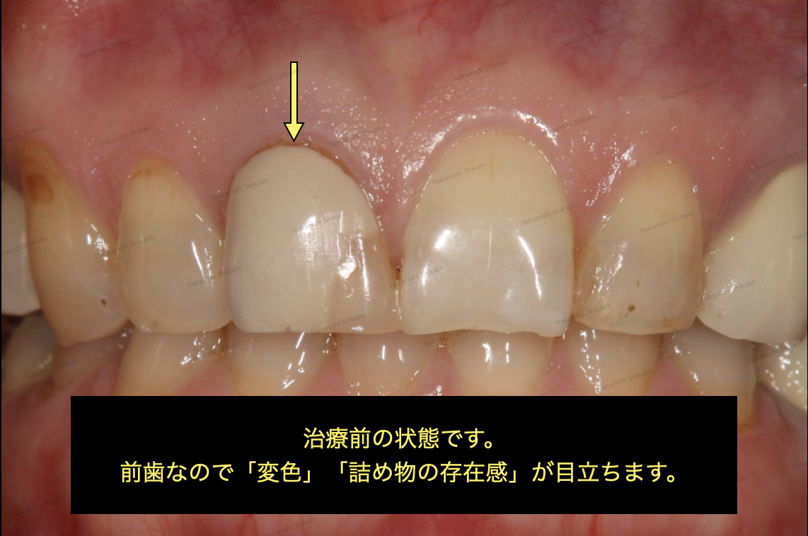 前歯がかけた時の治療方法で、小さい範囲の場合です。この時は「詰め物」を選択することが多いです。