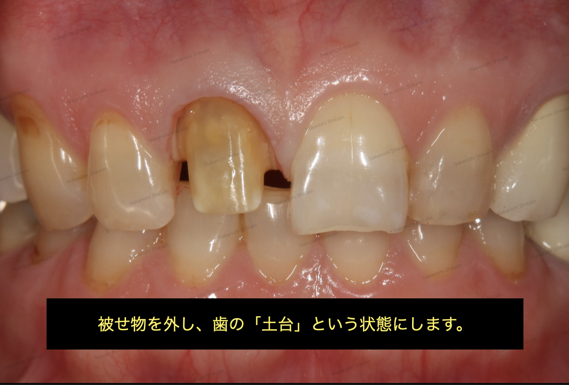 失敗・後悔しないセラミックス歯科治療として、実際の治療をご紹介します。写真画像のように、前歯の詰め物・被せ物の変色、偽物感が気になるので綺麗にしたいという希望がありました。前歯なので、会話や笑顔の時に人目につくため、綺麗にしたいということでした。第一段階として、被せ物を外し、見た目のカバーとして仮歯を作るところから始まります。