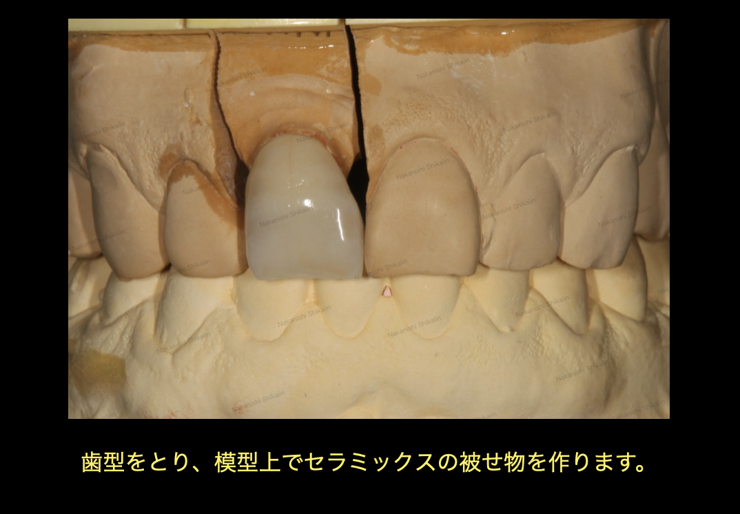 出来上がった模型でセラミックスの被せ物を作成します。あとはこれを実際にお口の中で調整してきます。