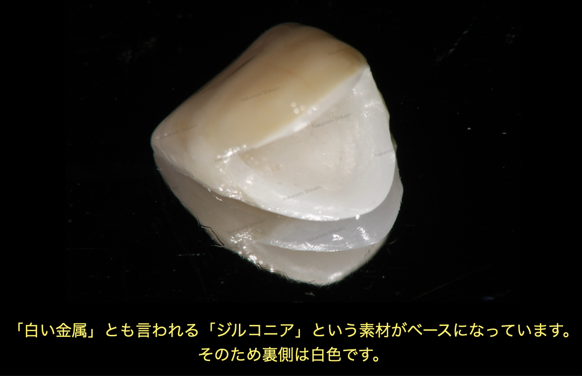 写真にあるように、表面は歯の色を再現したセラミックス(ポーセレン)が築成されていますが、歯の内側、上側は白色をしています。この白い部分がジルコニアと呼ばれるものです。