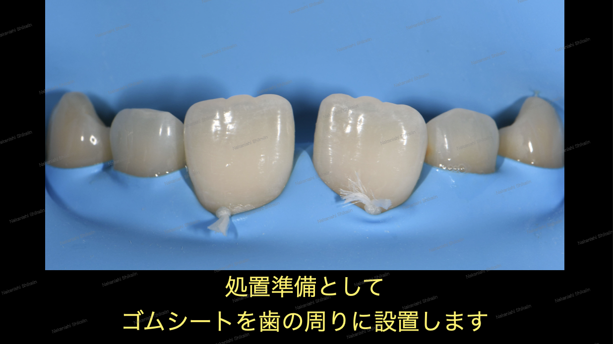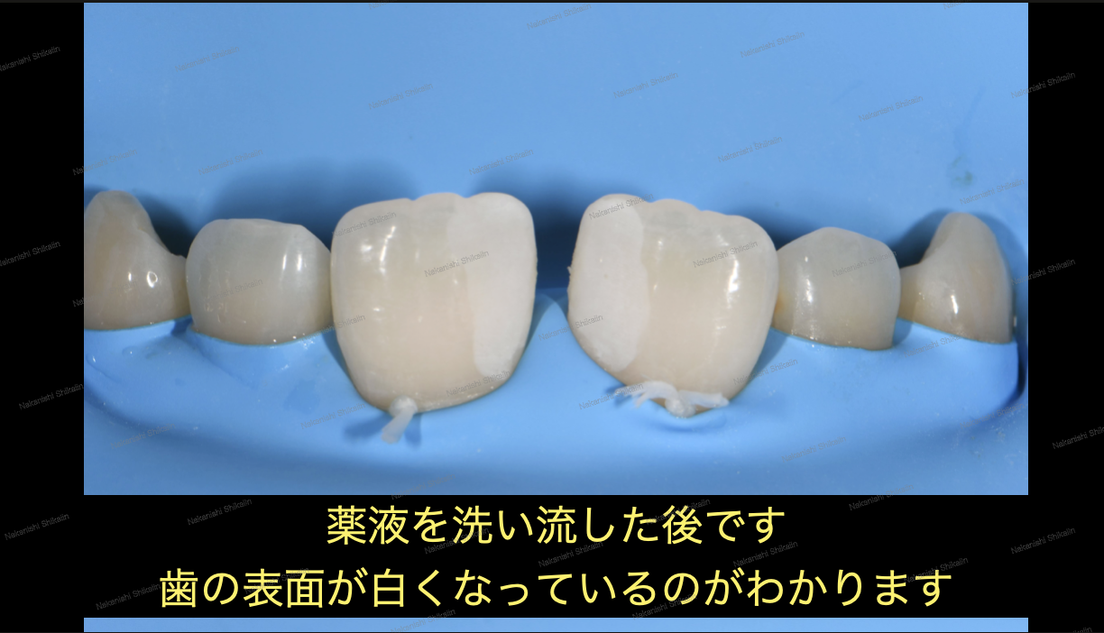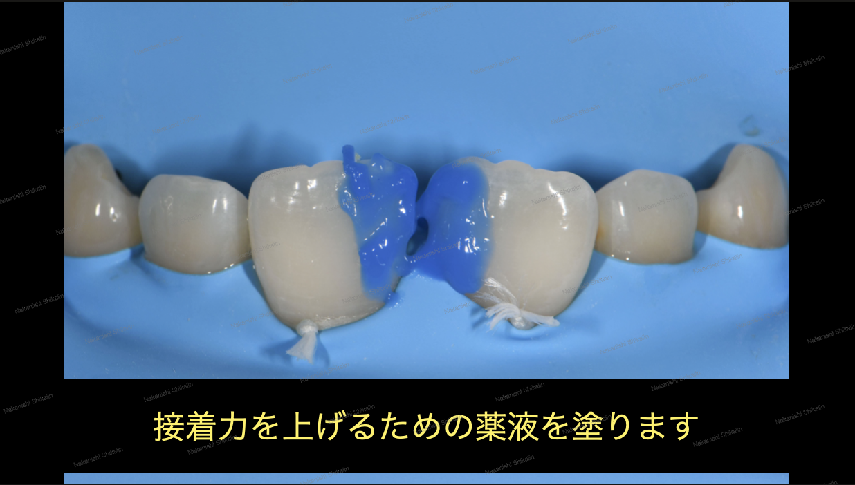 ②出来上がった薄いセラミックスを歯の表面に貼り付け、終了。