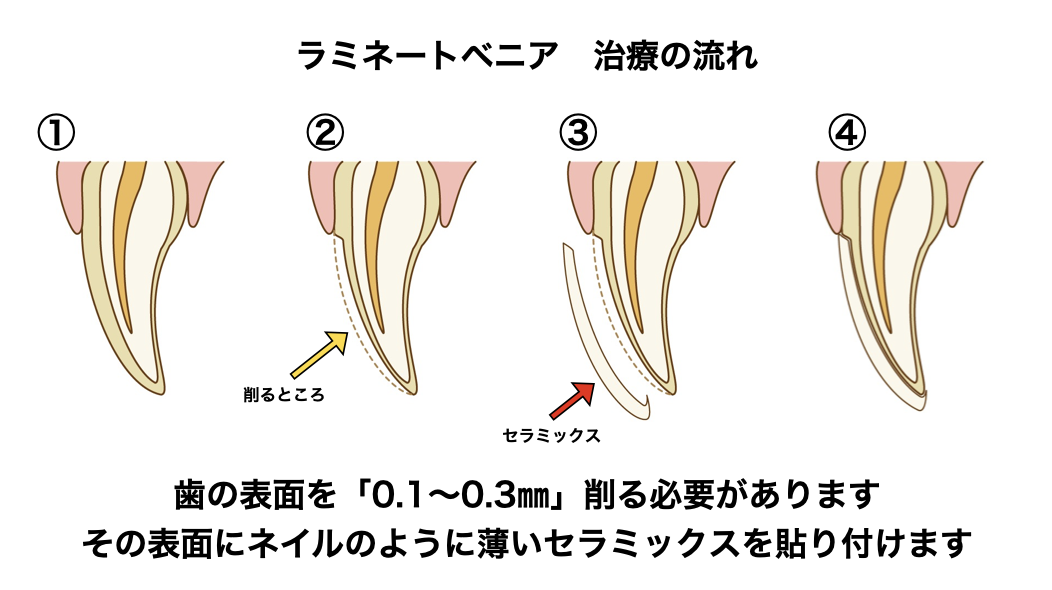 ラミネートベニアとは、その名の通り「ラミネート+ベニア」薄いセラミックスのベニア板を貼り付けることを言います。