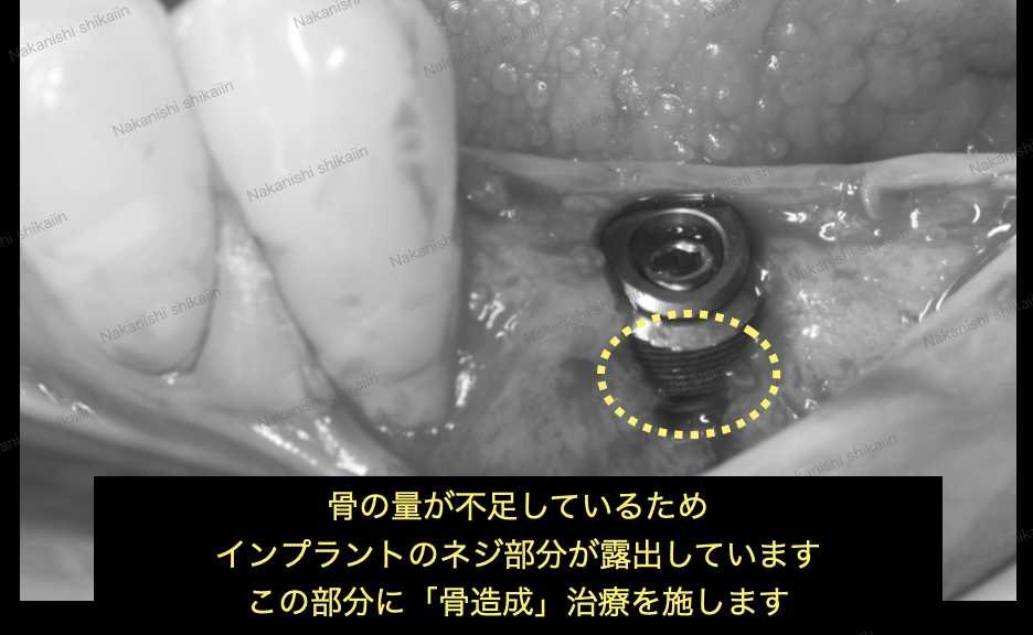 今回の場合、骨が細い部分があるため、インプラントのネジ部分が露出しています。本来はこのネジ部分は骨の中にあるべき部分です。この部分は骨の中に位置してほしい部分なので、この部分に骨再生療法、骨増生(GBR治療と言います)を施します。