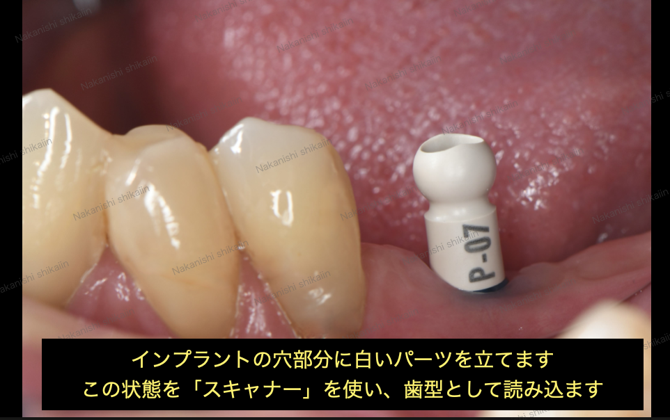 写真のように、インプラントのネジ穴を確認できます。ここに、スキャンするようのパーツを装着します。